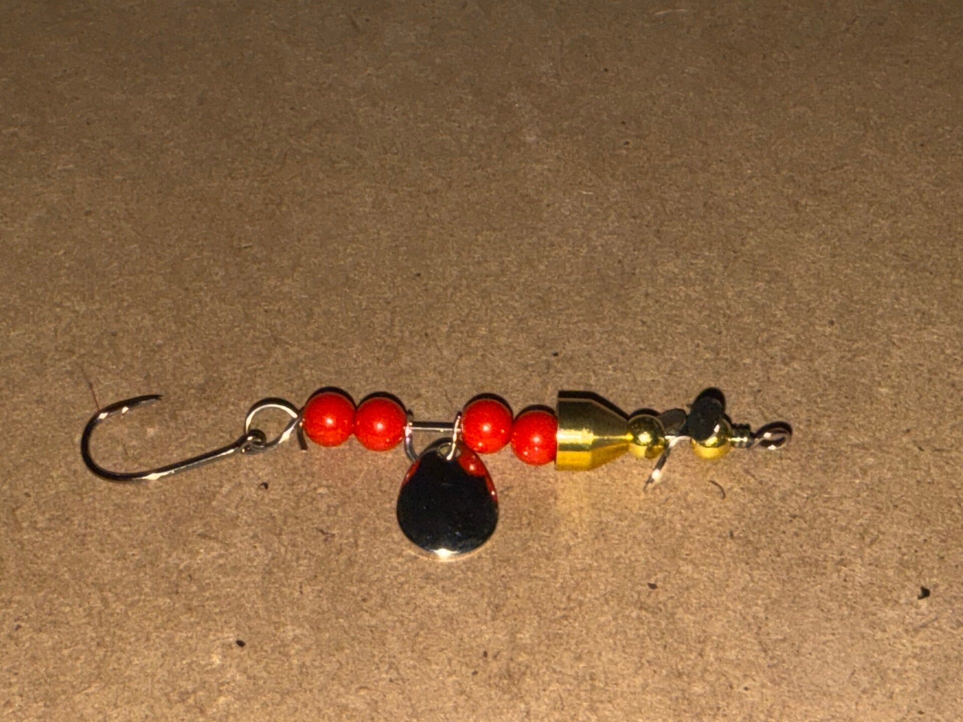 Ignite your next fishing trip with the EJ’s Fire Strike, a bold, bright inline spinner designed to deliver intense flash, smooth spin, and strike-provoking vibration. Built with vivid red beads, a polished silver blade, and a gold propeller tail, this lure brings heat to the water and pulls in attention from aggressive fish.